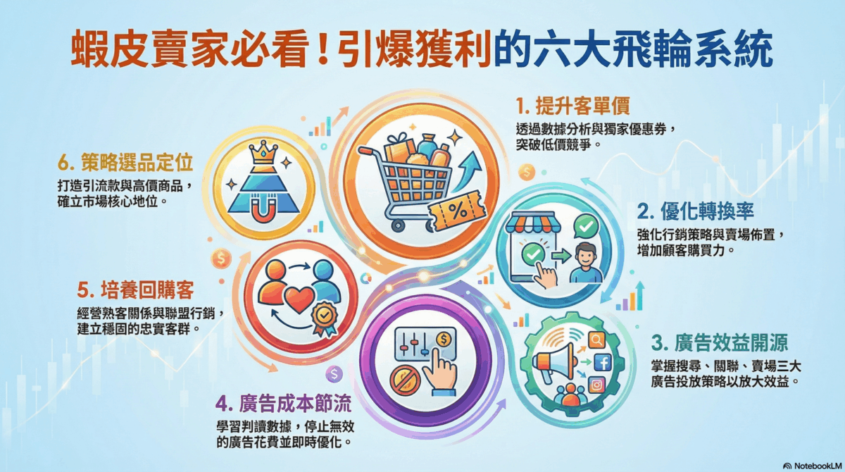 蔡品客老師開發的「蝦皮獲利六大飛輪系統」,這是一套全面的蝦皮電商經營方法論,旨在幫助賣家從憑感覺操作轉變為具備數據思維的專業經營者。我們將詳細說明這六個月陪跑計劃的三大階段,包括如何建立數據敏感度、穩定放大營收、以及培養獨立經營思維,讓您能夠真正掌握蝦皮平台的經營邏輯與技巧。